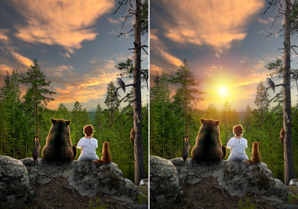 ”Kuva on Photoshop-ohjelmalla luotu ”kuvamanipulaatio”. Kuvassa on itse ottamiani maisemakuvia sekä kuvapankista ostettuja kuvia, joita olen syvännyt irti taustoistaan ja liittänyt yhteen. Olen yhdenmukaistanut elementtien koot, sävyt ja kontrastin sekä lisännyt digitaalisesti maalaamalla hahmoihin varjoja ja huippuvalokohtia. Lopuksi maisemaan on liitetty auringonlasku ja sen säteet”, Koivusilta kuvailee työprosessia.